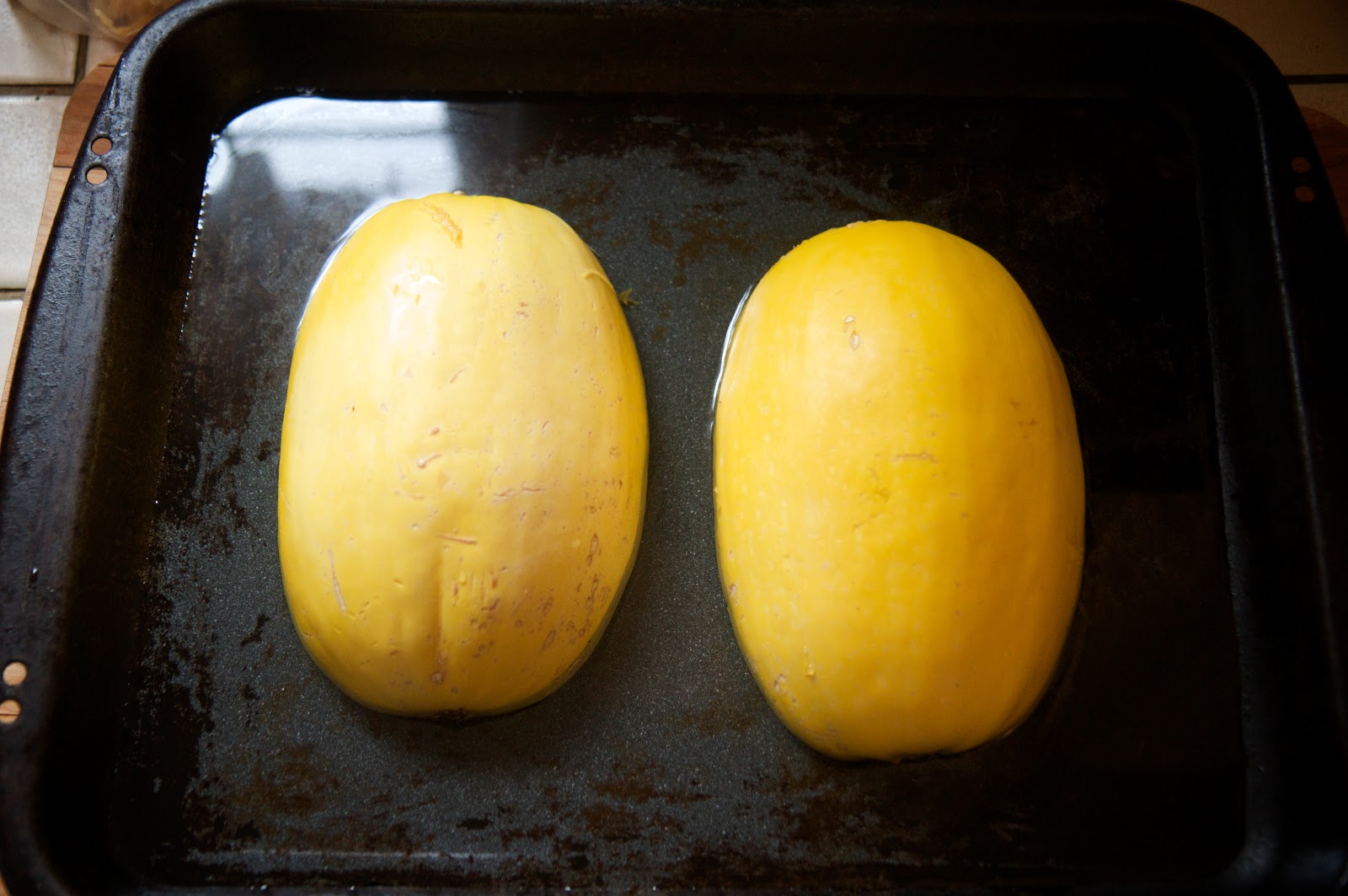 3. Place the squash faced down in a rimmed pan with a layer of water.